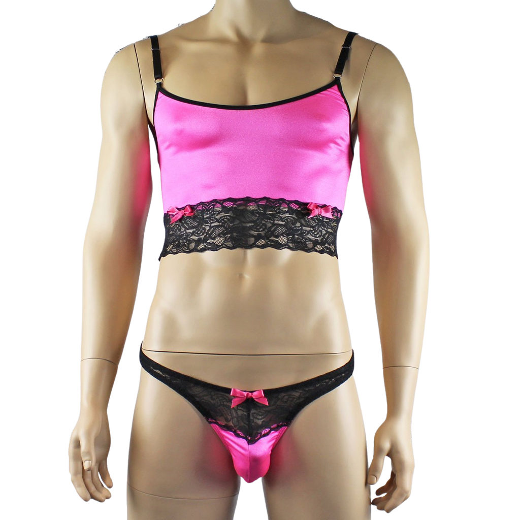 Mens Joanne Satin & Lace Crop Cami Top with Sexy Thong - Sizes up to 3XL Hot Pink and Black Lace