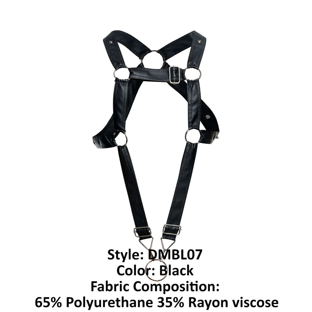Wide straps on harness on an imitation leather fabric. Completely open back and front. Metallic accents.
