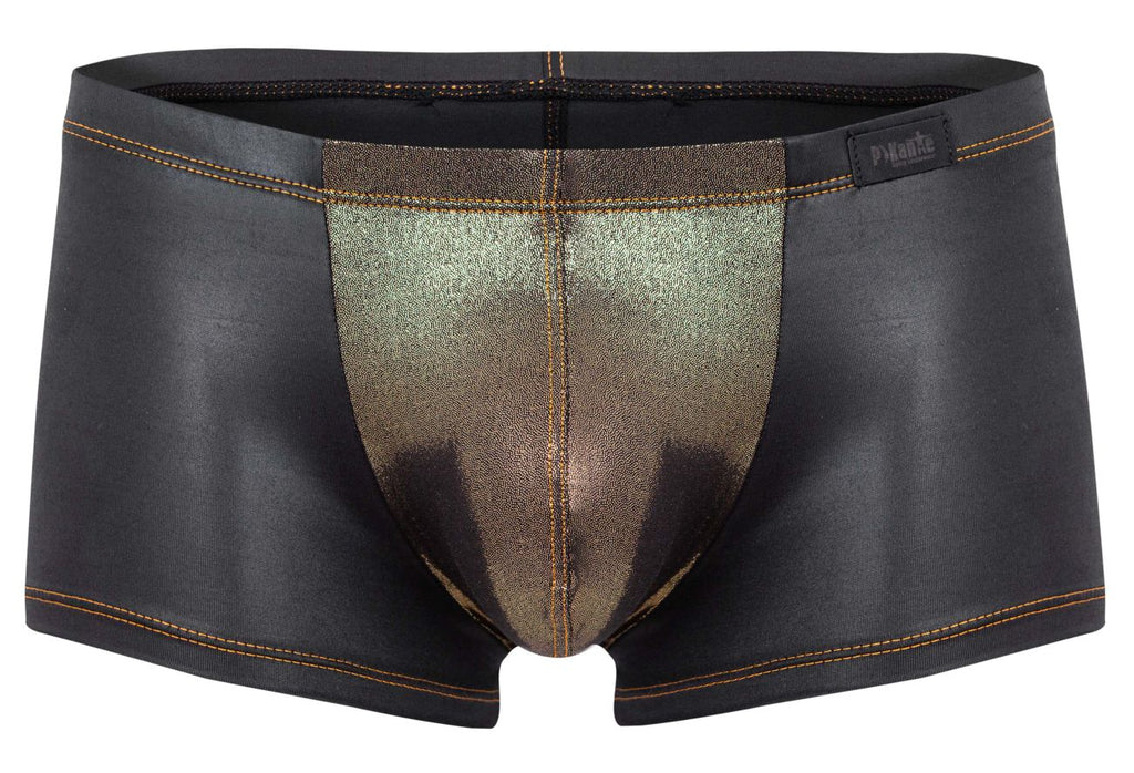 Own the spotlight in these black wet-look boxer briefs with a metallic gold front panel, a sleek, confidence-first style that looks as bold as it feels. The glossy finish hugs your body for a sculpted silhouette, while the contrasting gold pouch draws attention exactly where you want it.